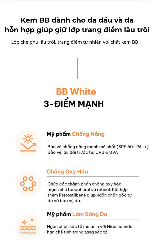 Kem BB White 5-trong-1 dành cho da dầu. Kết hợp công dụng làm sáng, chống oxy hóa và chống nắng hoàn hảo (SPF50+ PA+++).